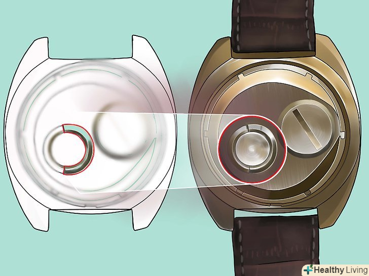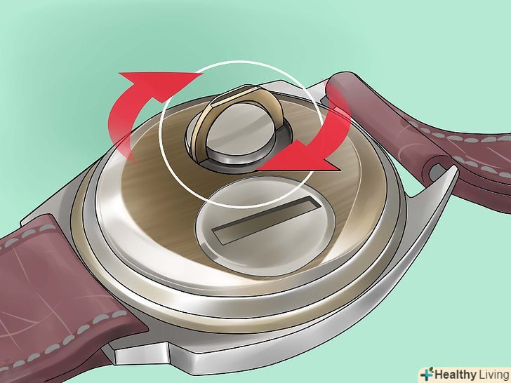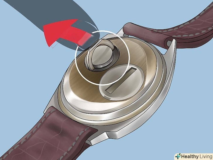 Знайдіть заводну головку ззаду на годиннику. переверніть годинник, щоб задня їх сторона перебувала обличчям до вас. Заводна головка буде розташована на задній стороні.- Знайте, що ззаду на годиннику ви можете побачити два кола. Коло поменше і буде заводний головкою. Велике коло являє собою силовий елемент, і під час цієї процедури з ним ми працювати не будемо.