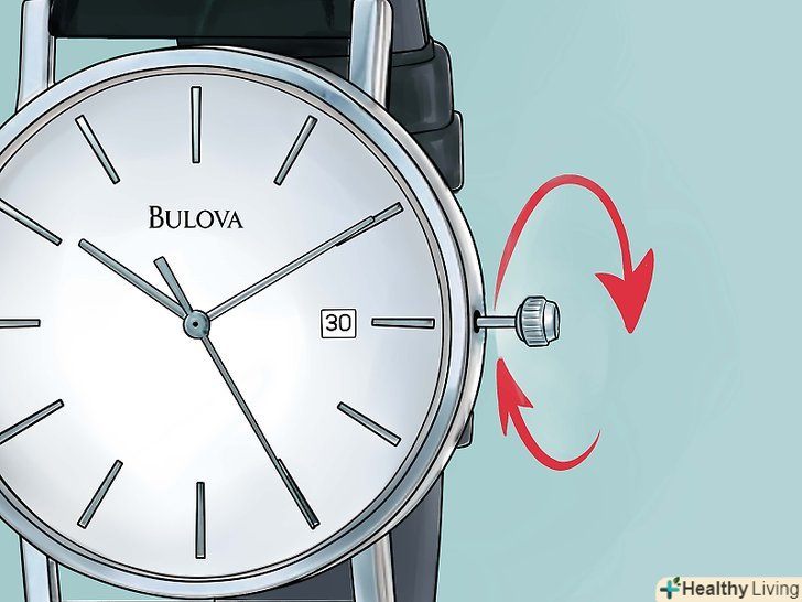 Покрутіть головку. покрутіть підняту заводну головку в будь-якому напрямку, поки годинна і хвилинна стрілки не будуть показувати правильний час.- У цих моделях годин Не важливо, в який бік крутити заводну головку – за годинниковою або проти годинникової стрілки.