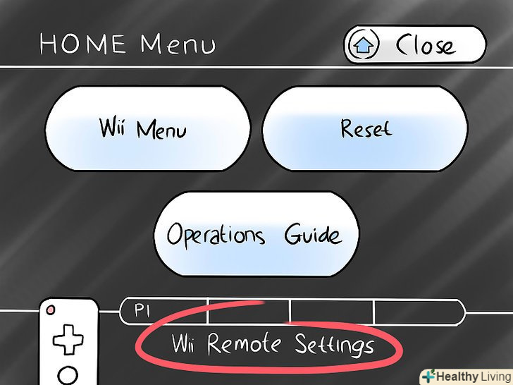 Виберіть Налаштування Wii контролера з меню кнопки "Home". інші опції це "Wii Menu», « Operations Guide», « Reset»і "Close".