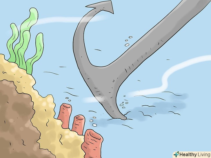 Не займайтеся риболовлею і не плавайте на човні поблизу коралових рифів. дотик якоря або рибальської мережі може пошкодити корали і навіть погубити їх. [2]- Не кидайте якір на території коралових рифів. Опускайте якір на піщане дно або швартуйтеся до берега. Замість якоря можна використовувати також Стоянковий буй. [3]