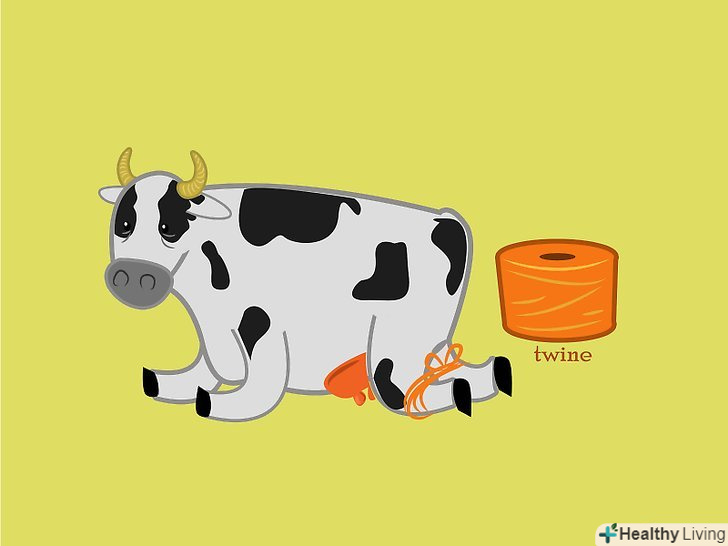 - Зв'яжіть між собою її задні ноги (якщо ви підозрюєте, що вона спробує встати без вас там, де необхідна ваша допомога) перешкоджаючи тому, щоб вона випадково сіла на шпагат при спробі встати на ноги. Зв'язування ніг зменшує можливість перелому ноги корови, порушення стегна або розриву м'язів її ніг. Помістіть її ноги на відстані 16 дюймів (40 см) і зв'яжіть ременем або мотузкою вище суглобів копит на кілька вузлів, таким чином, вона не зможе напружитися і не розірве петлю. Не хвилюйтеся, якщо корова буде накульгувати. При правильному зв'язуванні ніг це не завадить корові встати самостійно.
