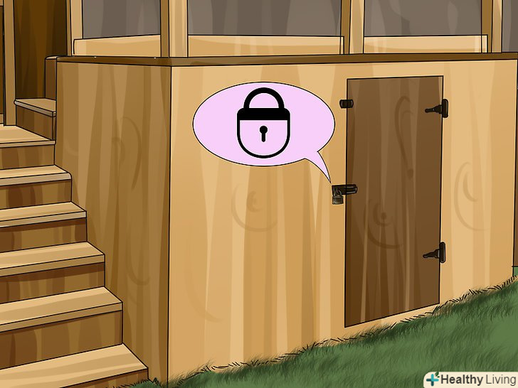 Прикрийте на зиму всі місця під терасами і порогами. Ведмеді люблять ховатися в таких місцях (особливо в зимовий час), тому заблокуйте їх. Заколотите їх дерев'яними дошками. Можна також забити дошками і інші місця, в які здатні пролізти ведмеді. [14]- Зміцніть двері в підсобних приміщеннях і захистіть вікна міцними віконницями. Ведмеді можуть спробувати сховатися в господарських прибудовах, особливо якщо вони впевнені в тому, що поруч немає людей. [15]