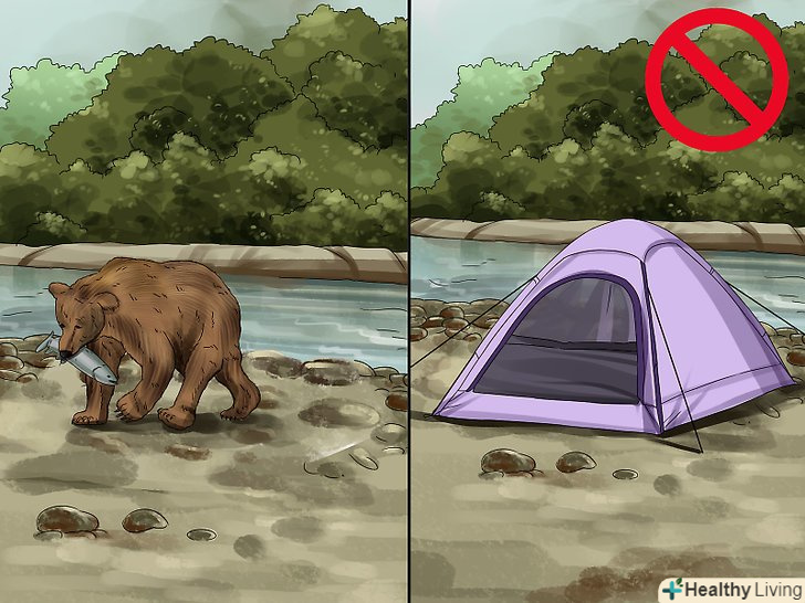Розбивайте табір в стороні від тих місць, які приваблюють ведмедів. Ведмеді люблять відвідувати туристичні стежки і рибні місця. Крім того, їх часто можна зустріти біля останків тварин. Ведмеді можуть навідатися в табір і в тому випадку, якщо ваші попередники залишили за собою харчові відходи. Уникайте подібних місць і намагайтеся розбивати табір подалі від них. [16]- Вибирайте для табору відкриті ділянки, де можна заздалегідь помітити наближення ведмедя.