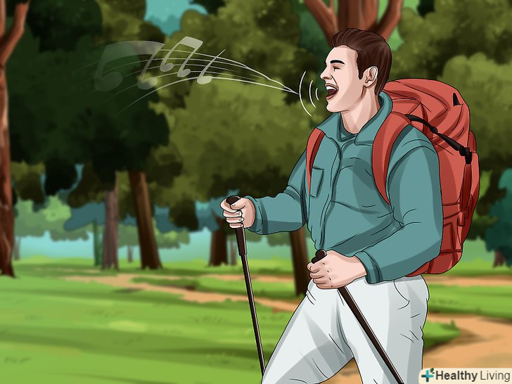 Намагайтеся не мовчати під час піших переходів: Розмовляйте, співайте і видавайте інший шум. Ведмідь найнебезпечніше в тому випадку, якщо застати його зненацька. Шум позначить вашу присутність, і тварина, швидше за все, постарається сховатися. [26]- Якщо вам не хочеться говорити, включіть радіоприймач.