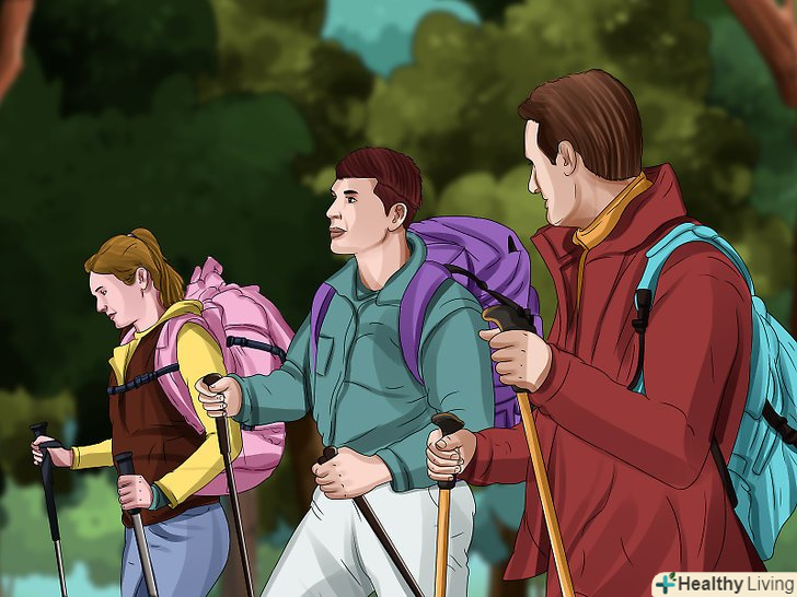 Подорожуйте групою, щоб відлякати ведмедів. Ведмідь, швидше за все, наблизиться до самотньої людини, а не групи людей. Кілька людей видають більше шуму, і звір віддасть перевагу ретируватися. [27]