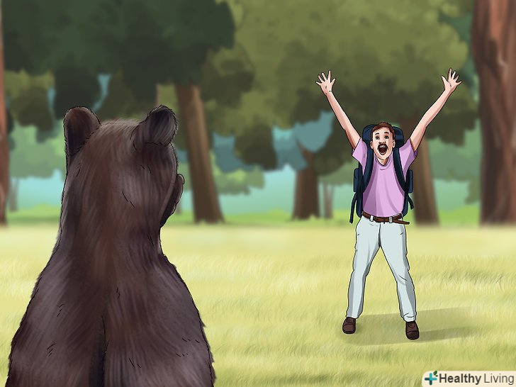 Залишайтеся на місці, якщо ведмідь наближається до вас. Ведмеді бігають набагато швидше людей, і якщо ви побіжите, то можете спровокувати звіра переслідувати вас. Замість цього махайте руками і видавайте гучні звуки. Часто ведмеді вважають за краще піти, а не нападати. [29]- Не дивіться ведмедю в очі, так як він може сприйняти це як загрозу. [30]