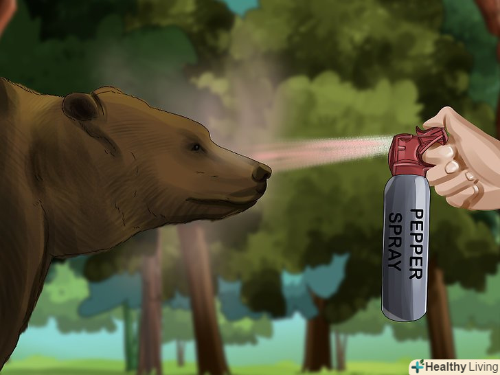 Використовуйте спрей від ведмедів, якщо звір нападе на вас. це різновид перцевого аерозолю, який розбризкується далі, ніж інші подібні спреї. Він розпорошується на відстань до 10 метрів. Якщо ведмідь наближається до вас, розпиліть хмару рідини між собою і звіром. [32]- Щоб використовувати спрей, зніміть балончик з запобіжника і натисніть на сопло. Розпиліть спрей, коли ведмідь опиниться приблизно в 10-20 метрах від вас. Якщо ведмідь підійде ще ближче, можна бризнути спреєм прямо йому в морду.