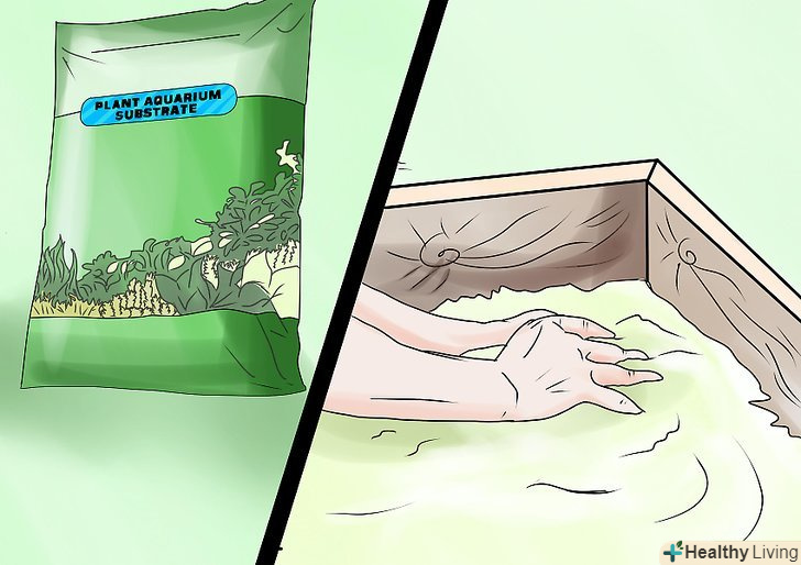 Додаємо субстрат. покрийте половину корпусу землею (повинна бути удобрена, без хімікатів), а іншу половину мохом сфагнум. Сфагнум є відмінним субстратом, так як він добре утримує вологу, просто зволожуйте його щодня теплою водою.- Проконсультуйтеся з ветеринаром перш, ніж використовувати інший вид субстрату, так як деякі субстрати (наприклад, деревна тирса) можуть надавати небезпеку для черепахи.