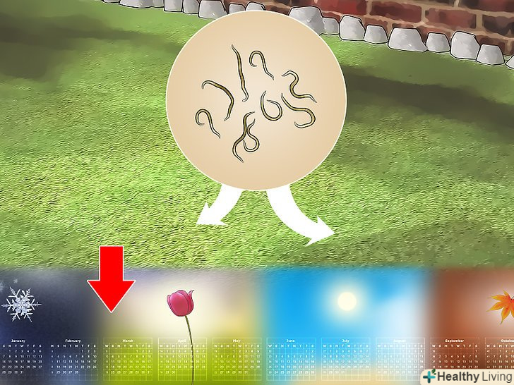 Ранньою весною поширюйте на своїй ділянці корисних черв'яків (нематод). ці крихітні круглі черв'яки харчуються личинками бліх. Їх можна придбати в магазині товарів для саду та городу. Пошукайте черв'яків, які спеціально призначені від бліх, і відповідно до рекомендацій поширите їх по галявині і грядках. [12]- Приділяйте особливу увагу тим місцям, де люблять з'являтися ваші домашні вихованці. Найкраще поширювати черв'яків на початку сезону появи бліх, тобто ранньою весною.