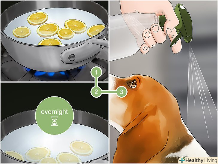 Спробуйте обприскувати вихованця цитрусовим розчином. залийте в каструлю 500 мілілітрів води і покладіть в неї тонко нарізаний лимон. Доведіть воду до кипіння, після чого зніміть каструлю з плити, накрийте кришкою і залиште на ніч. Потім процідіть воду, залийте її в пляшку з розпилювачем, обприскати тварина і розітріть розчин по його шерсті. [9]- Цитрусовий Аерозоль для домашніх тварин можна також придбати в зоомагазині.