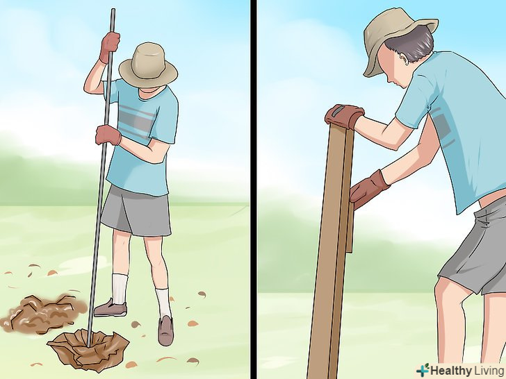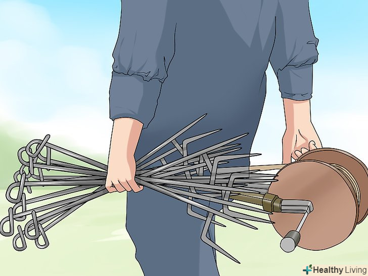 - Ви можете проігнорувати інші кроки вище і відразу перейти до закладки тимчасових стійок. Такі стійки не вимагають Копера для забивання, так як у них є частина біля основи, яка дозволяє вам помістити ногу і встати на неї, використовуючи свою вагу, щоб вбити стійку. Переконайтеся, що вони відносно прямі. Встановіть інтервали між стійками приблизно 3-3, 6 м.