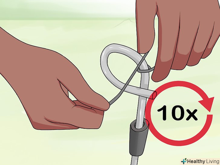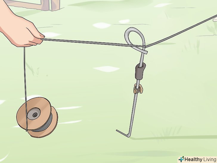 Оберніть провід першого ізолятора в дужки, принаймні, 10 разів, перш ніж натягнути інші уздовж кожного ізолятора і повісити їх до кожного тимчасового стовпа. потягніть дріт так, щоб він не був занадто тугим, але і не вільним. Оберніть дріт в граничному ізоляторі з іншого боку лінії, поки достатня кількість дроту не буде обгорнуто в нього, або достатньо для того, щоб ви могли спуститися до нижнього ізолятора і продовжити роботу з нижніми проводами. Щоб прикріпити іншу ділянку електричного паркану, використовуйте рифовий (або плоский) вузол, щоб з'єднати обидві ділянки разом.- Стовпи зі скловолокна мають такі гачки, де дріт просто пристібається.