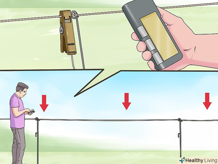 Встановіть дріт. залежно від того, скільки складових ви хочете мати для вашого паркану, як правило, краще почати зверху вниз. Верхній дріт повинен бути на рівні носа ваших корів (що становить близько 80-90 см від землі). Найчастіше переносні стовпи, які ви придбали, зроблені так, що провід дійсно проходить на рівні носа корови, що створює менше клопоту, щоб встановити його. Використовуючи ізолятор, вставте цвях через частину ізолятора, який дозволяє пройти цвяху і забийте його в дерев'яний стовп. Якщо ви встановили дерев'яні стійки, повторіть це для кожної з них, пам'ятаючи кількість проводів, які ви плануєте встановити.- Якщо ви використовуєте тільки одножильну огорожу, то ізолятори повинні бути встановлені точно на рівні, відповідному стійок, або приблизно на відстані 80-90 см від землі. Всі три дроти (якщо це-трьох-дротова огорожа) повинні бути розташовані приблизно на відстані 30 см один від одного. У двухпроводного забору обидва дроти повинні бути розташовані на відстані приблизно в 45 см.