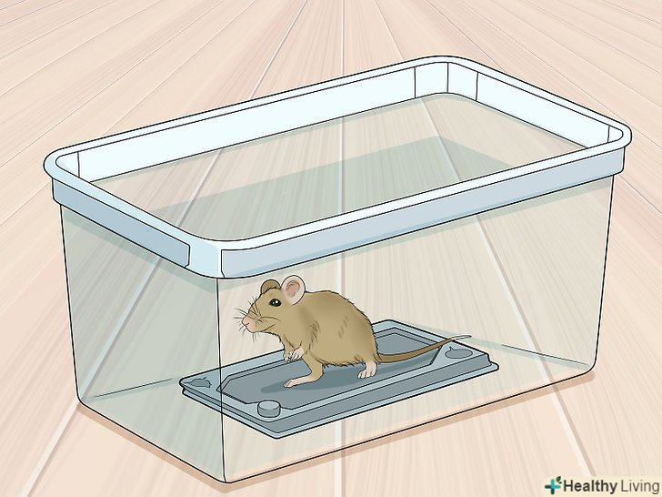 Помістіть мишу в контейнер. підніміть пастку з мишею і акуратно перемістіть її в прозорий пластиковий контейнер або коробку . Розміри контейнера повинні перевищувати розміри липкої пастки, а його глибина — становити не менше 10 см.