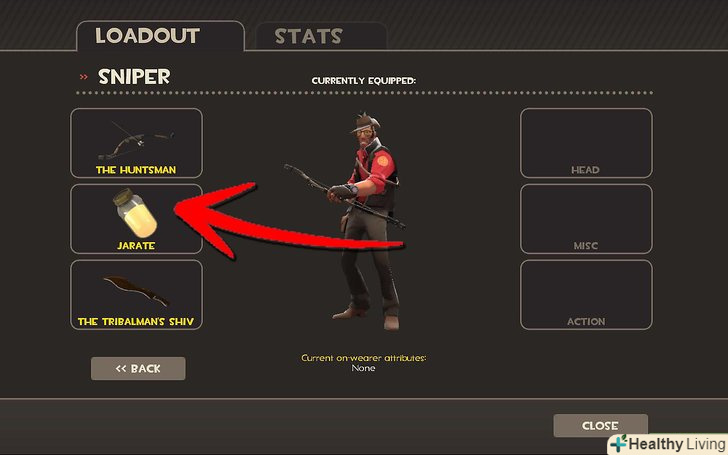 - Зброя "Jarate", воно ж" Банкате", це просто банку з сечею, яку можна запустити у ворога. Всі удари по облитому сечею ворогові виходять міні-критичними, тобто завдають на 35% шкоди більше, ніж зазвичай. Допомагайте команді, обливаючи ворогів наліво і направо! До слова, якщо облити шпигуна, то ви зможете бачити його навіть тоді, коли той піде в режим невидимості. Заряд у банки всього один, відновлюється він 20 секунд. Взяти банку можна з шафки снайпера, що стоїть в респавн-кімнаті (там, де ви з'являєтеся після смерті). Питання про те, навіщо снайперу в шафці нескінченні банки з сечею, залишається відкритим... Банкате замінює SMG в слоті додаткової зброї.