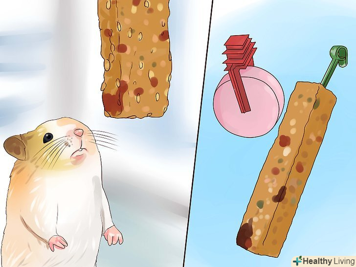 Давайте хом'яку тверді ласощі. дуже важливо приблизно раз на тиждень годувати хом'яка твердими ласощами. Вони необхідні, щоб підтримувати зуби хом'яка в хорошому стані, а також в якості джерела додаткових поживних речовин і просто як зміна раціону.- У зоомагазині ви можете купити ласощі, які будуть звисати з верхівки клітини. Це змусить хом'яка напружитися, щоб роздобути їжу, крім того, для нього це буде те саме грі.