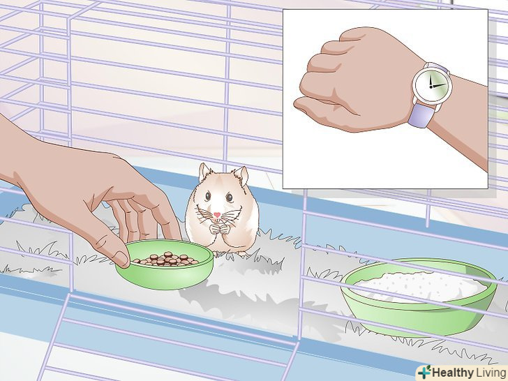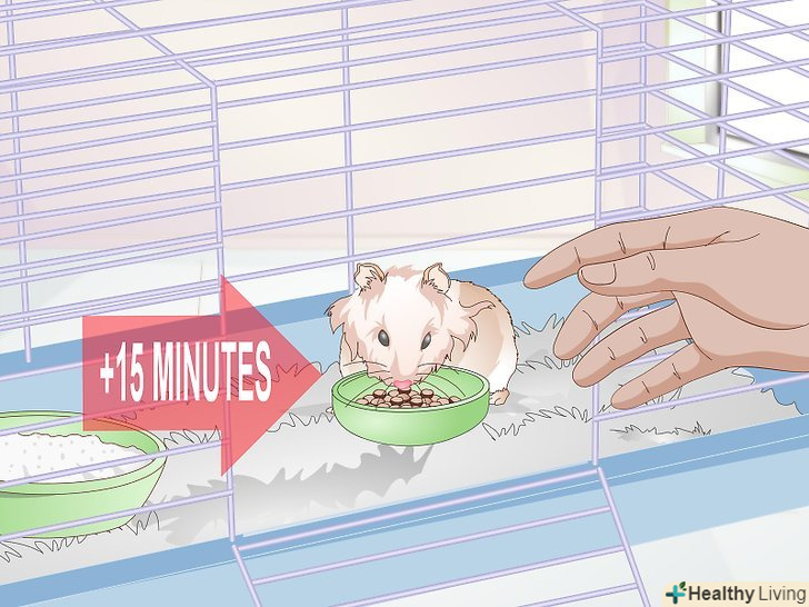 Годуйте хом'яка в певний час. склавши таблицю добової активності вихованця (особливо важливо точно визначити час, коли він прокидається), почніть годувати хом'яка в один і той же час (відразу, як він прокинеться). Наприклад, якщо ваш вихованець прокидається о 8:30 ввечері, встановіть час годування вихованця на 8:30. Щодня дотримуйтесь цього розкладу як мінімум тиждень, після чого переходите до наступного кроку. [11]