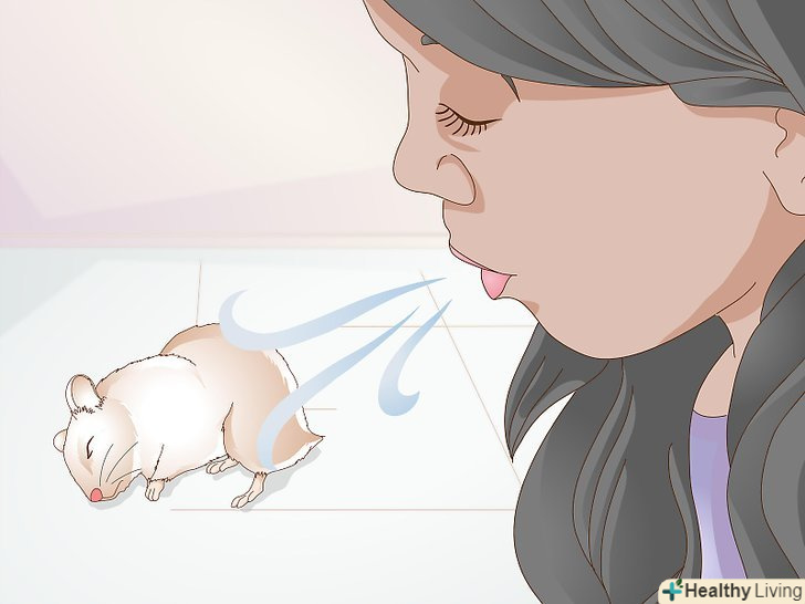 Подуйте на мордочку тварини. якщо ваш вихованець спить не в будиночку, а у відкритій частині клітини, ви можете розбудити його, обережно подувши на мордочку. Щоб не налякати свого вихованця, спочатку просто видихайте повітря, а потім подуйте трохи сильніше, поступово збільшуючи інтенсивність, поки хом'як не почне прокидатися. [3]