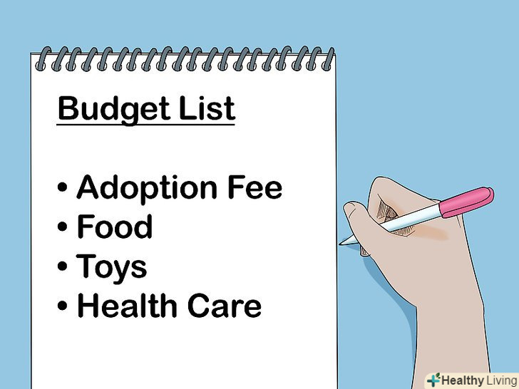 Розрахуйте бюджет. обдумуючи питання придбання вихованця, важливо врахувати і фінансові витрати. Деякі вихованці, наприклад, коні, коштують дуже дорого. Інші ж, наприклад, рибки, вкрай доступні за ціною. [3]- Проведіть власне дослідження вартості різних вихованців. Також відвідайте зоомагазин і подивіться, скільки коштують такі речі, як корм, іграшки та клітини.