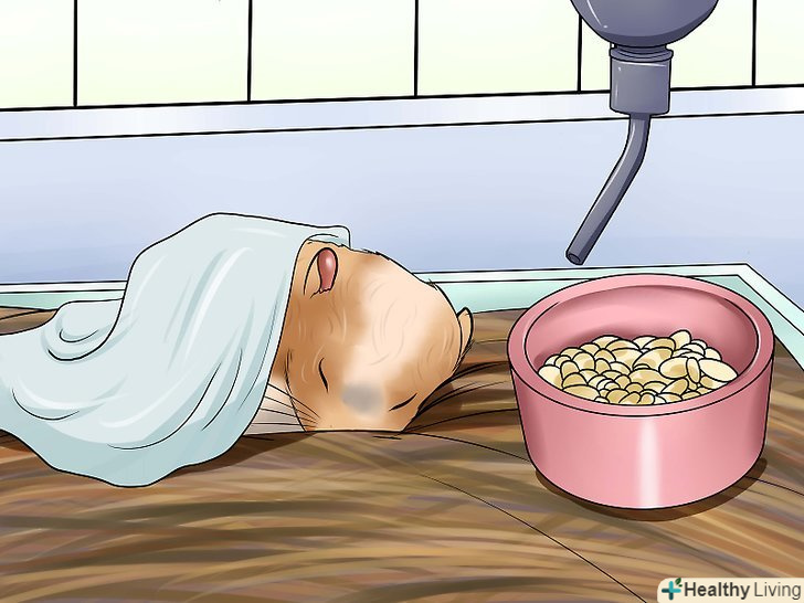 Посадіть хом'яка назад в клітку. яку б травму не отримав ваш вихованець, необхідно, щоб у нього була можливість відпочивати і одужувати в безпечному, спокійному просторі його клітини. Поставте миски з водою і їжею поруч з тим місцем, де хом'ячок зазвичай спить. [15] знайдіть для клітки тепле, Тихе місце в будинку, де хом'ячка ніхто не потурбує.- Звичайна клітина не дуже добре підходить для хом'яка, який отримав травму, оскільки прути решітки можуть ще сильніше травмувати тварину. [16] якщо у вас є можливість, обладнайте будиночок для потерпілого хом'яка в акваріумі. Якщо у вас в будинку немає відповідного акваріума, а покупка нового не вписується у ваші фінансові можливості, вам доведеться постійно стежити, щоб хвора тварина не постраждала, коли пересувається по клітці.