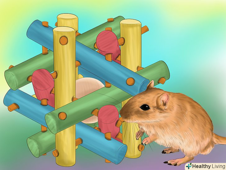Надайте піщанкам іграшки. тільки стежте за тим, щоб іграшки не були виготовлені з м'якого пластику, інакше піщанки вигризуть їх в тріски. Постарайтеся підібрати такі іграшки, які піщанки не зможуть розгризти, наприклад, з твердих порід дерева. [4]- Будь-які картонні предмети також будуть погризені, але це не завдасть шкоди самим піщанкам.
