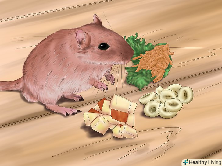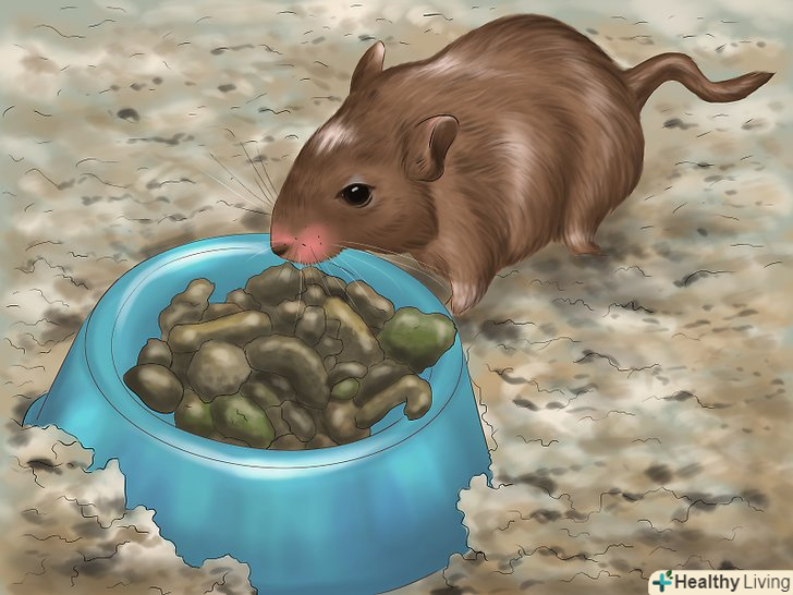 Годуйте вихованця спеціальною зерновою сумішшю для піщанок. постарайтеся знайти в зоомагазині корм, спеціально призначений для піщанок. Дотримуйтесь рекомендацій по добовому дозуванні корму на кожну піщанку, зазначеним на його упаковці. Давайте годуємо в невеликому керамічному блюдце (ставте його на дно клітки).- Один із способів зміцнити взаємини з піщанкою — витягувати з корму найбільше насіння (наприклад, соняшнику) і згодовувати їх вихованцеві з рук.