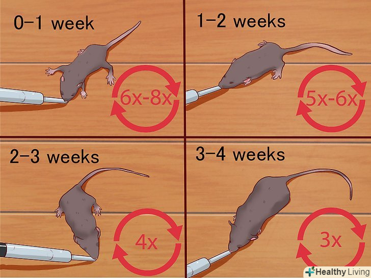 Часто годуєте мишенят. мишенят у віці до одного тижня необхідно годувати 6-8 разів на день, у віці 1-2 тижнів — 5-6 разів, в 2-3 тижні — по 4 рази на день, а в 4 тижні — всього по 3 рази. [8] розподіліть всі добові годування на рівну кількість годин один від одного. Пам'ятайте про те, що вам доведеться годувати мишенят і ночами.