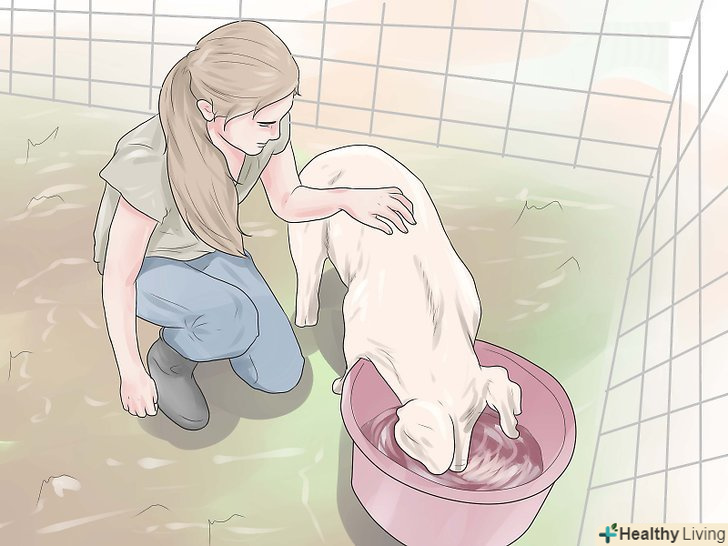 Розгляньте варіант створення грязьової калюжі для свиней. Свині люблять бруд, це правда. Їм дуже складно підтримувати температуру тіла, тому в спеку грязьова калюжа для них все одно що басейн. Виділіть частину свинарника під грязьову калюжу. Можна побудувати низький парканчик або викопати невелику канавку, щоб бруд залишалася тільки в одній частині приміщення. Розпушити землю під грязьову калюжу і раз або два в день додавайте туди води (можливо, і частіше, якщо ви живете в особливо жаркому кліматі). [4]- Бруд також запобігає ризику появи у свиней вошей, дозволяє їм копатися в землі (а вони це особливо люблять) і підтримує їх шкіру в хорошому стані.