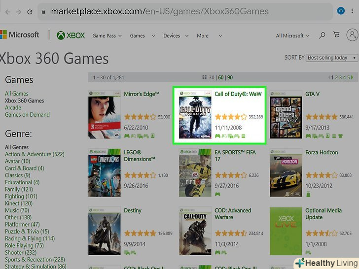 Виберіть гру. Клацніть самої продаваної грі на головній сторінці або введіть назву гри в рядку пошуку в правому верхньому кутку сторінки, натисніть ↵ Enter, а потім клацніть по потрібній грі.- Якщо у гри також є версія для Xbox One, клацніть по грі, у верхній частині якої зеленим по білому написано»Xbox 360".