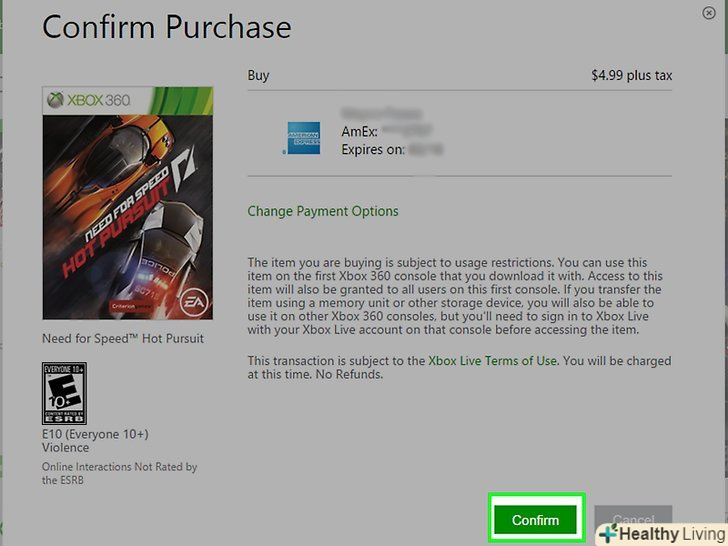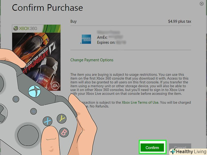 ВиберітьПідтвердити покупку і натисніть A.так ви купите гру і завантажте її на Xbox 360.- Якщо у вас є код для завантаження гри, виберіть "Змінити спосіб оплати«, натисніть» A«, виберіть» Код«, а потім натисніть» A" і введіть код.