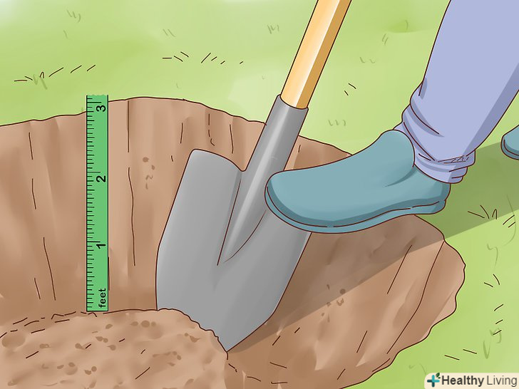 Вирийте яму. якщо у вас велика тварина, яма повинна бути не менше метра глибиною. Якщо тварина маленька, буде достатньо 50-60 сантиметрів. Пам'ятайте, що вам, можливо, доведеться збільшити розмір ями, якщо у вас є масивний ящик. Яма повинна бути такого розміру, щоб в неї помістився ящик. [14]- Якщо ви хочете, щоб тіло розклалося в грунті, яма може бути менш глибокою (буде достатньо 45 сантиметрів за умови, що коріння і камені розташовуються на відстані не менше 30 сантиметрів під дном ями). Над твариною має бути як мінімум 45 сантиметрів грунту. Якщо буде потрібно, зробіть горбок.
