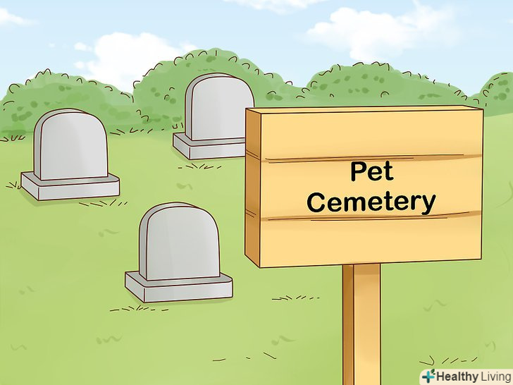 Виберіть кладовище. якщо в місті кілька кладовищ для тварин, при виборі вам слід врахувати кілька факторів. Один з факторів-це ціна. Ще один фактор-це розташування (вам напевно буде зручніше зробити це ближче до будинку). Крім того, вам варто запитати, чи залишиться кладовище кладовищем, якщо перейде до інших власників. [20]