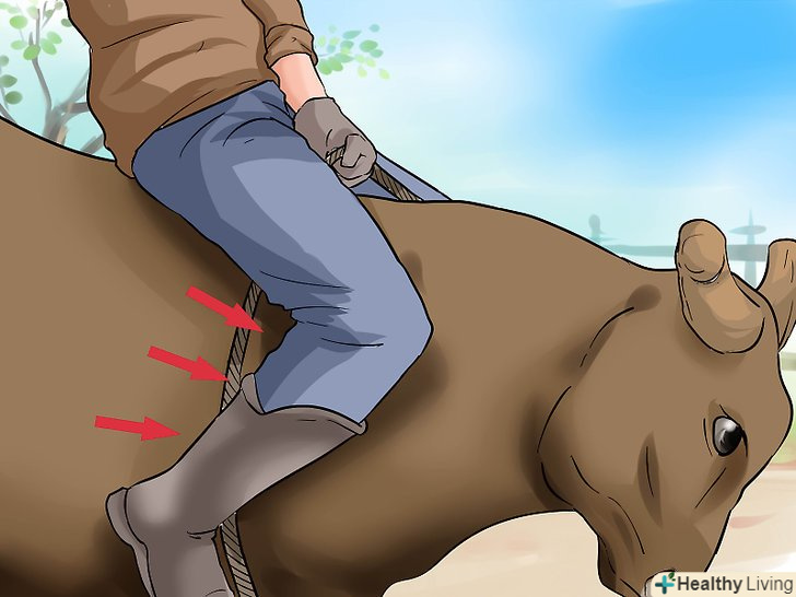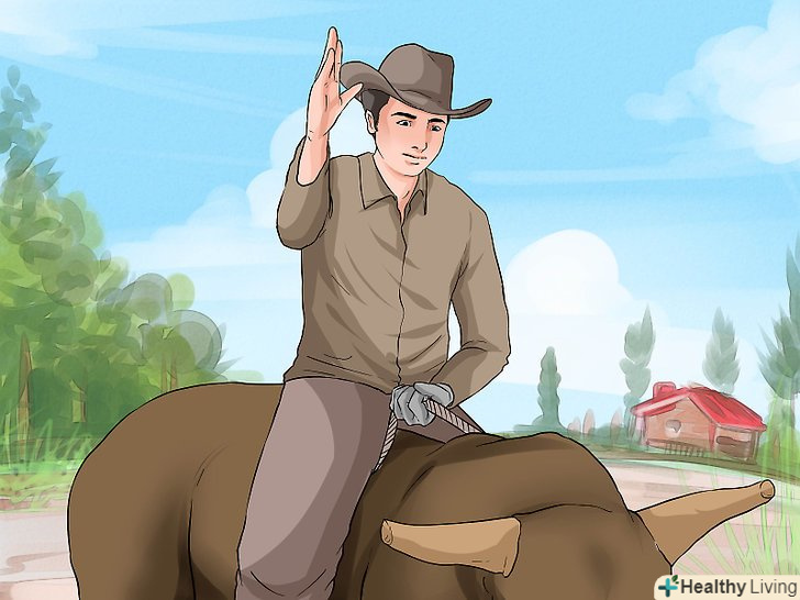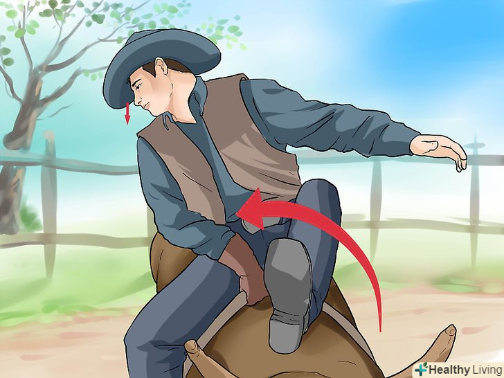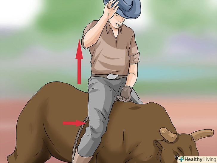 Тримайтеся. коли передня нога Бика відривається від землі, нагніться вперед і Стисніть ваші ноги, одночасно міцно утримуючи рукоятку вашої мотузки робочою рукою, яка діє як центр ваги на тварині. Тримайте ваші стегна в центрі і у формі квадрата. Коли ж Бик починає опускатися після стрибка, штовхніть стегна до мотузки і підніміть її робочою рукою.- Намагайтеся утриматися якомога ближче до центру спини бика. Неправильно збалансуєте і пересунетеся лише на кілька сантиметрів - і в лічені секунди опинитеся обличчям в грязі. Зосередьтеся на основному балансі, створеному рукояткою і вашими стегнами.