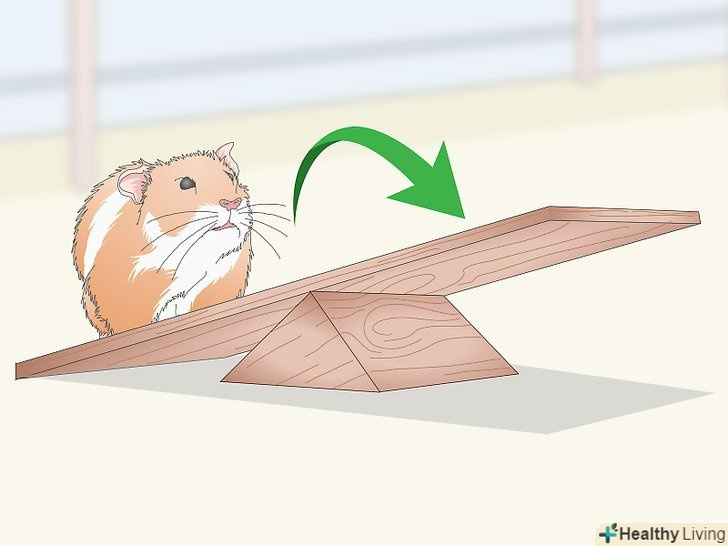 Створіть гойдалки з плоскої планки і підставленого під неї трикутного блоку. Хом'ячку сподобається бігати по розгойдується планці. Візьміть тонку дерев'яну планку розміром близько 15-20 см в довжину і досить широку, щоб на ній міг поміститися хом'ячок. Встановіть планку на трикутний дерев'яний блок, щоб нижній її кінець знаходився з того боку, звідки з'явиться хом'ячок, що долає смугу перешкод. [11]- Для найкращих результатів ширина трикутного блоку повинна бути приблизно тією ж, що і у дерев'яної планки, або навіть більше. Через занадто вузького блоку планка може перекинутися набік.