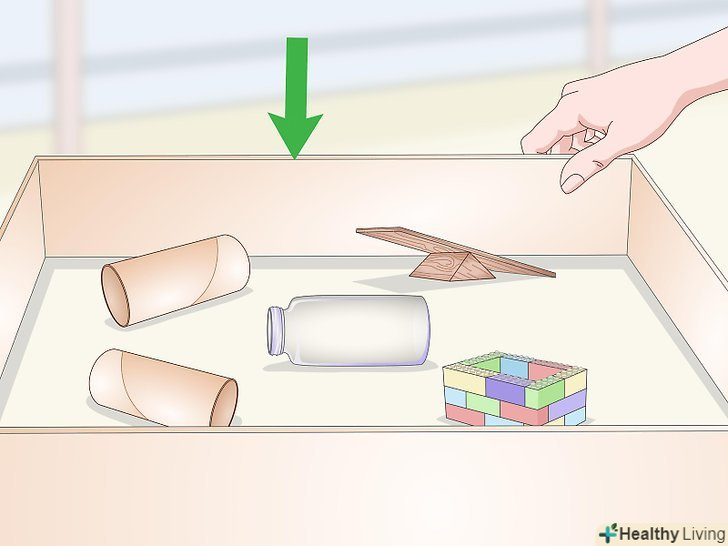 Встановіть огорожу вздовж смуги перешкод, щоб хом'ячок долав її в правильному порядку. спорудити навколо смуги перешкод огорожу висотою близько 15 см, використовуючи для цього картон або кубики. Розташуйте огорожу досить близько до об'єктів смуги перешкод, щоб хом'ячок не міг оббігти їх навколо, не виконавши поставлену перед ним завдання. [13]- З великих кубиків може вийти досить надійна стіна. Для найкращих результатів спробуйте використовувати LEGO Duplo або аналогічні конструктори. Якщо ви використовуєте картон, ймовірно, вам буде потрібно трохи зігнути його або приклеїти до нього додаткові опори з зовнішньої сторони, щоб картонне огорожу було стійким.