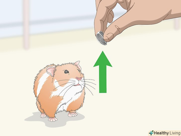 Тримайте ласощі над головою хом'ячка, щоб навчити його команді «стояти». команда "стояти" - найпростіша команда, з якої можна почати вивчення трюків. Тримайте ласощі над головою хом'ячка таким чином, щоб він не міг його дістати, і скажіть команду «стояти». Хом'ячок встане на задні лапки, щоб підібратися до ласощів. [3]- Навчаючи хом'ячка, не поспішайте, щоб у вихованця був час освоїти кожен необхідний крок. Почніть з привчання хом'ячка вставати на задні лапи. Коли він звикне підніматися за ласощами, введіть голосову команду. Не забувайте щедро хвалити хом'ячка за успішне виконання трюку!