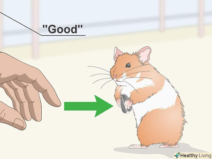 Віддавайте ласощі вихованцеві відразу, як тільки він встане, і не забувайте Ласкаво хвалити його словами «добре» або «молодець». якщо хом'ячок не встане на задні лапки, не віддавайте йому ласощі і чекайте, коли він все ж виконає команду. [4]- Якщо хом'ячок наполегливо відмовляється вставати на задні лапи після тривалого вашого очікування і неодноразового повторення команди «стояти», ймовірно, він не голодний. Приберіть ласощі і спробуйте позайматися з вихованцем трохи пізніше.