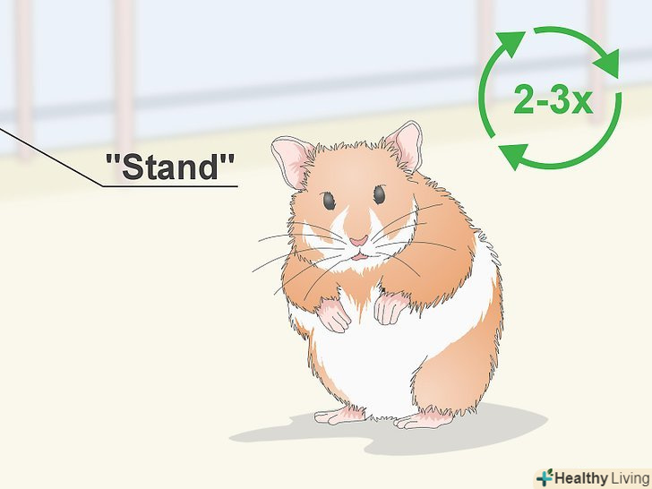 Працюйте над вивченням тільки однієї команди і повторюйте уроки по 2-3 рази на день протягом 1-2 тижнів. для вивчення більшості трюків потрібно 1-2 тижні щоденних занять. Продовжуйте практикувати виконання команди» стояти " по 2-3 рази на день, поки хом'ячок дійсно її не освоїть. [5]- Перевірте знання команди з використанням лише занесених над головою хом'ячка пальців (без ласощі). Скажіть команду "стояти". Якщо після цього хом'ячок встане на задні лапки, то він насправді вивчив даний трюк. Почастуєте його ласощами за виконання команди.