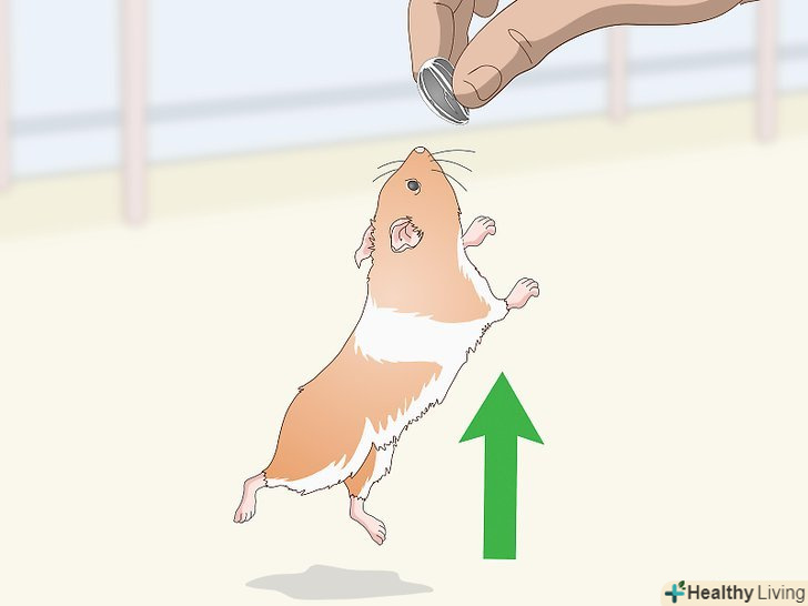 Тримайте ласощі трохи вище і відсувайте його вгору і вперед, щоб навчити хом'ячка команді «стрибок». як тільки хом'ячок освоїть команду «стояти», можна спробувати навчити його стрибати. Для стрибка тримайте ласощі трохи вище і чекайте, коли хом'ячок встане. Потім швидким стрибкоподібним рухом відсуньте ласощі ще вище і трохи вперед і скажіть команду «стрибок». [6]- Якщо хом'ячок спробує стрибнути слідом за частуванням, коли ви його перемістіть, негайно віддайте ласощі вихованцеві і похваліть його.