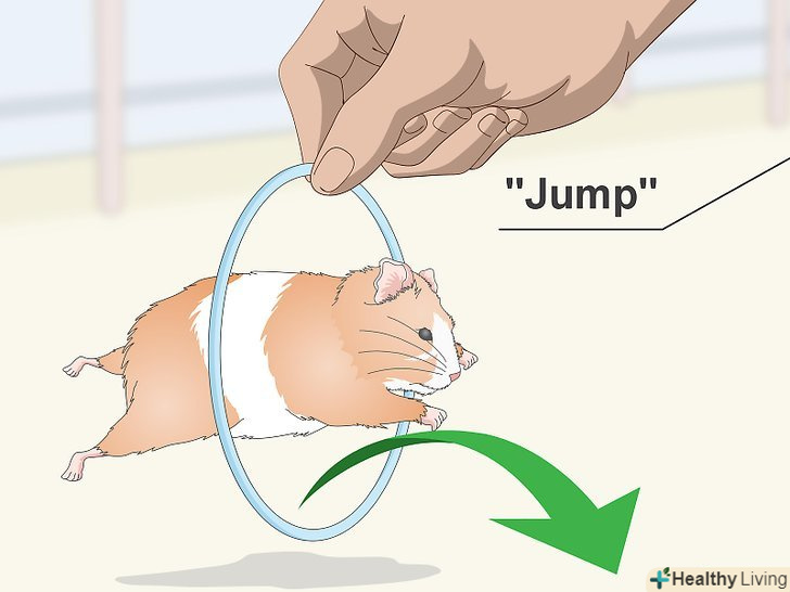Скористайтеся кільцем і ласощами, щоб навчити хом'ячка стрибати через кільце. деякі хом'ячки швидше освоюють стрибки через кільце, ніж звичайні стрибки, так як в цьому випадку присутній видимий об'єкт, який їм необхідно подолати. Для роботи візьміть тонке пластикове кільце, вільний металевий або пластиковий браслет або ж браслет-спіраль. Виставте кільце перед хом'ячком, а ласощі піднесіть з іншого боку від кільця. [7]- Подайте команду "стрибок в кільце" або просто "стрибок", поки тримаєте кільце з ласощами. Якщо хом'ячок пройде через кільце, негайно почастуєте його і похваліть.