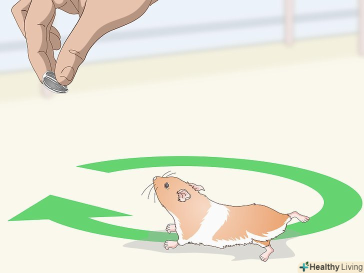 - Якщо хом'ячок не побіжить за ласощами, приберіть його на кілька секунд, а потім поверніться до команди «стояти», за виконання якої почастуєте вихованця. Потім знову спробуйте подати команду»коло". Якщо хом'ячок знову не побіжить по колу, приберіть ласощі і поверніться до занять трохи пізніше. [8]