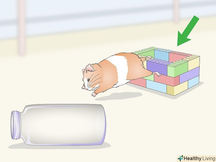 Для стрибків з перешкодами використовуйте кубики або дрібні баночки. Створіть хом'ячку перешкоди для стрибків, наприклад, з деталей LEGO або дерев'яних кубиків. Також можна використовувати невеликі баночки з-під харчових продуктів, на які зможе піднятися хом'ячок. Почніть розставляти перешкоди на підлозі там, де збираєтеся створити смугу перешкод. [9]- Перешкоди не повинні бути занадто високими, інакше хом'ячок віддасть перевагу їх обійти. Якщо хом'ячку важко підійматися на будь-яку перешкоду, постарайтеся зробити його нижче. Якщо ж Ви користуєтеся банками, спробуйте для початку взяти плоскі баночки.