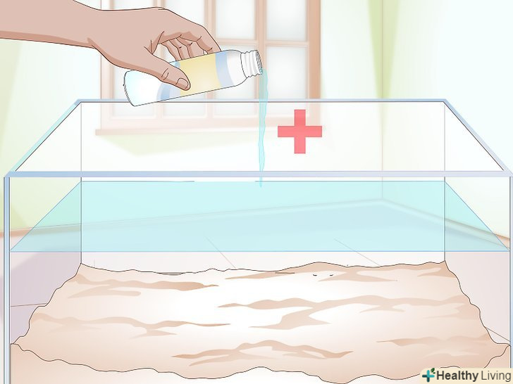 Дехлоруйте свіжу воду. водопровідна вода може містити високу концентрацію хлору, яка здатна завдати шкоди вашій черепасі. Але це можна виправити шляхом додавання у воду безпечного для тварин дехлоруючого засобу. Даний крок особливо важливий, якщо ви мили Акваріум за допомогою хлорного відбілювача, так як дехлоруючий засіб нейтралізує будь-які залишкові сліди хлору, які можуть нашкодити вихованцеві.- Наповніть Акваріум за допомогою чистого відра, попередньо налив в нього воду з-під крана у ванній.