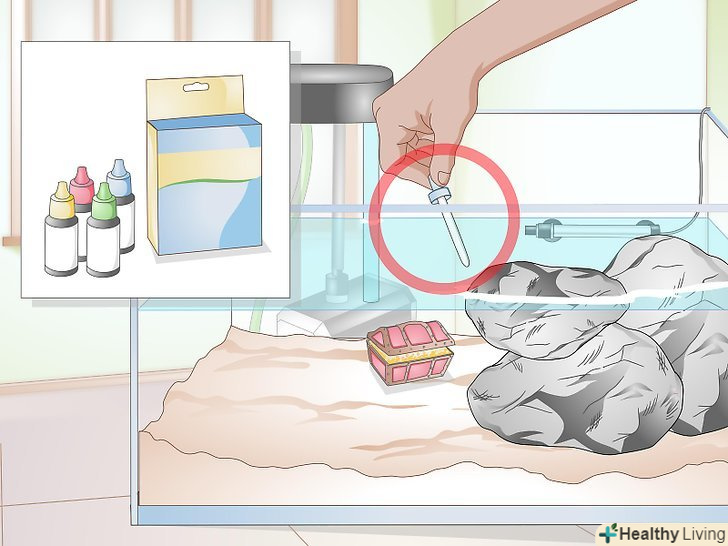 Перевірте температуру води. Температура води в акваріумі повинна знаходитися в межах 21-26,6 градусів Цельсія. Це середні показники кімнатної температури, тому якщо вода трохи тепліше або прохолодніше необхідного, почекайте від 30 до 60 хвилин і знову перевірте її температуру. [6] якщо вода занадто холодна, скористайтеся водонагрівачем, щоб підвищити її температуру.