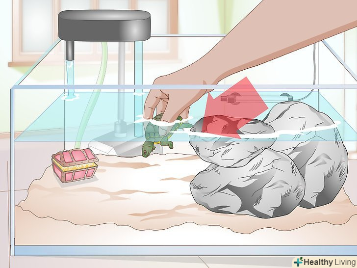 Поверніть черепаху в акваріум. обережно поверніть черепаху назад на її улюблене місце відпочинку в акваріумі. Заохочуйте вихованця частуванням, наприклад, смачним черв'яком, шматочком салату або іншим улюбленими ласощами.- Коли все в акваріумі виявиться на своїх місцях, вимийте руки сильнодіючим антибактеріальним милом. [12]