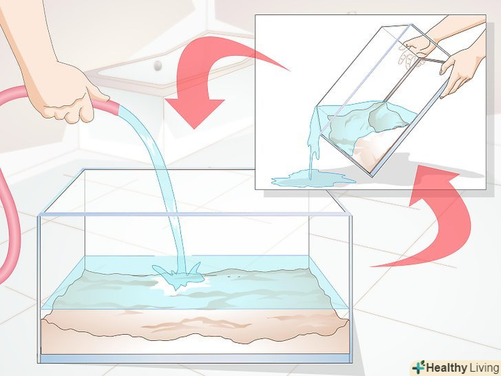 Промийте грунт. за допомогою садового шланга або звичайного крана у ванній наповніть акваріум водою приблизно на чверть, а потім спорожніть. Повторіть цю процедуру приблизно п'ять разів, поки вода в акваріумі не стане значно чистіше, ніж до того, як ви приступили до процесу миття.- Щоб спорожнити Акваріум, сядьте навпочіпки, розширивши ноги, а не намагайтеся стоячи підняти ємність м'язами рук і спини. До того моменту, коли практично вся вода з акваріума витече, сам акваріум займе майже вертикальне положення.