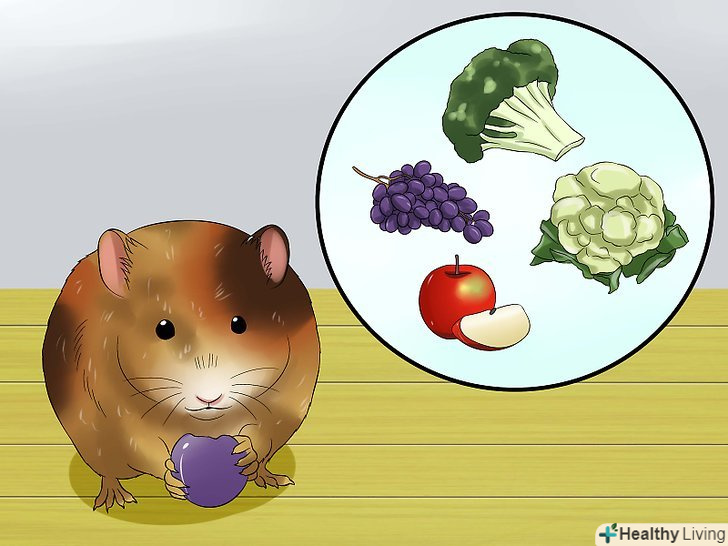 - Вагітним хом'ячкам буде корисно додаткову кількість вітамінів і мінералів, що містяться в овочах і фруктах, в таких як брокколі, огірки, цвітна капуста, яблука, виноград, банани і полуниця, проте давати їх слід в дуже обмеженій кількості (інакше виникне ризик появи проблем з травленням). [9]