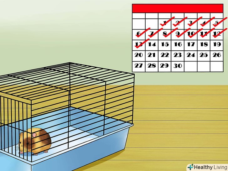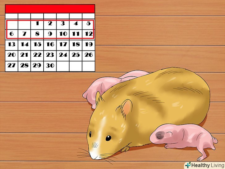 Надайте самці спокій приблизно з тринадцятого дня після спарювання. вагітні самки хом'ячків воліють побути в повній самоті, принаймні пару днів перед пологами. Це означає, що з тринадцятого дня після спарювання ви не повинні чіпати що-небудь всередині клітини, включаючи підстилку. Будьте максимально обережні, коли кладете в клітку свіжий корм. Ваша необережність може привести до того, що самка з'їсть новонароджений приплід. [10]- Так як ви можете не знати точну дату спарювання, майте на увазі, що самка починає «демонструвати» ознаки вагітності приблизно на десятий день після спарювання. [11]