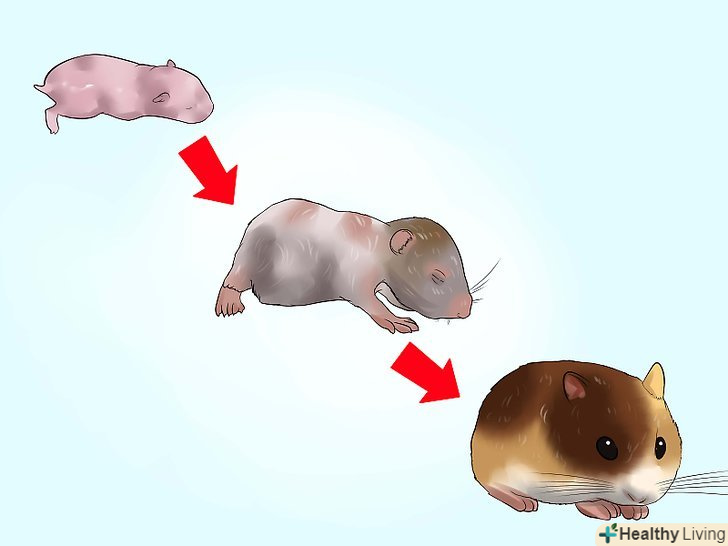 Необхідно розуміти, як розвивається організм маленьких хом'ячків. [6] Хом'ячки народжуються неймовірно вразливими: лисі, глухі, сліпі, з ледве-ледве працюючими кінцівками. Проте, організм малюків швидко розвивається. Потрібно знати приблизний розвиток на кожному тижні, щоб стежити, що все нормально:- 5-15 днів: повинні відкритися очі і вуха