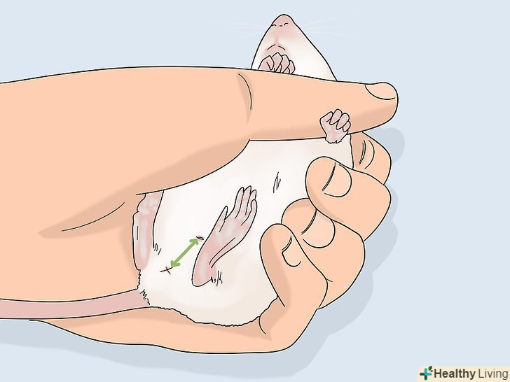 Переверніть мишу на спину, щоб перевірити область геніталій. Візьміть мишу за загривок на шиї і переверніть на спину. Якщо тварині некомфортно в такому положенні, просто поверніть його до себе задньою частиною тіла і підніміть підставу хвоста, щоб вам було чітко видно геніталії. [2]- Дуже важливо лише піднімати миша за основу хвоста і ніколи не піднімати в повітря всі чотири її лапи. Забезпечте опору хоча б двом переднім лапам, наприклад у вигляді долоні або клітини. Якщо ви повністю піднімете миша в повітря, то ризикуєте зламати їй хвіст або спину. Не потрібно травмувати тварину і завдавати йому біль.